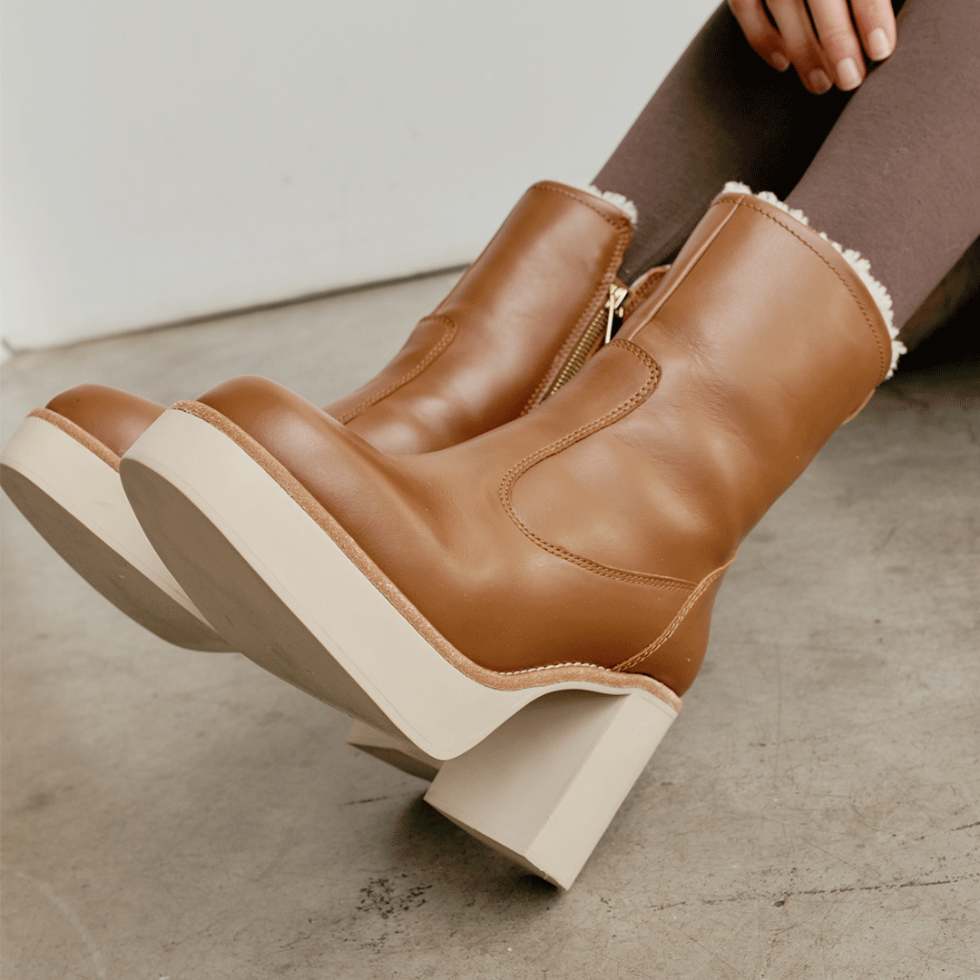 Zipper adjusts to any leg width. Designed with an inside zipper, three-part memory foam system and soft shearling lining.