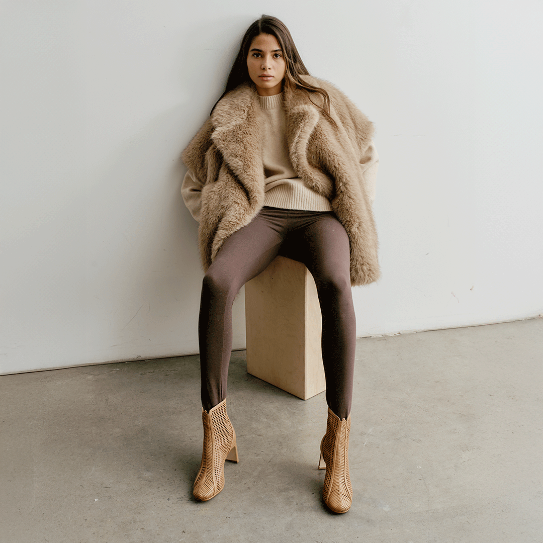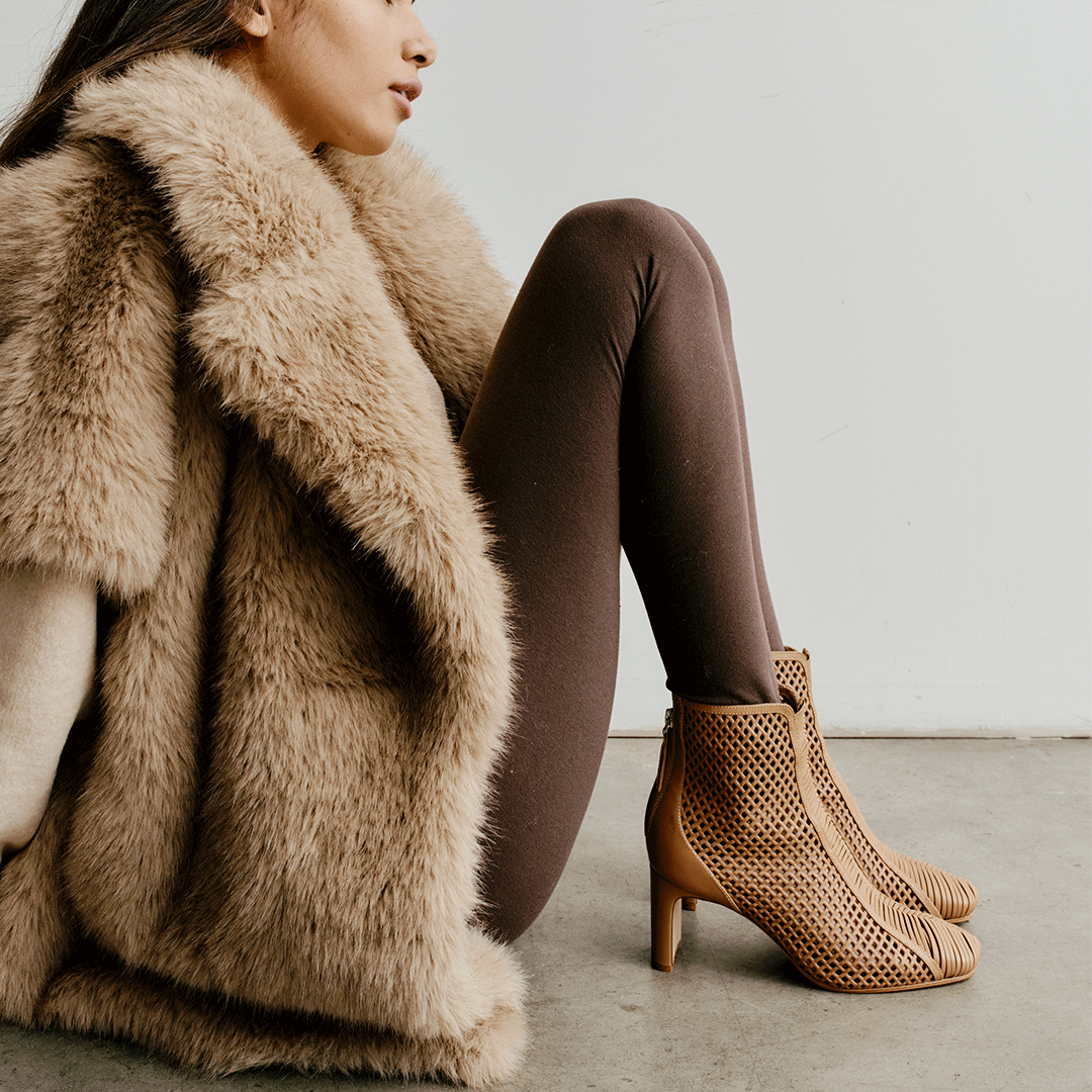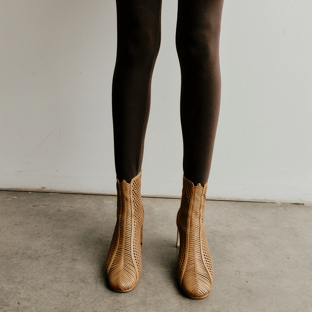 Custom laser cut leather material is softened and tumbled multiple times to mold to your foot for a beautiful and slender effect. Back zipper opening is adjustable to different leg widths. Each pair is handwoven by our artisans.